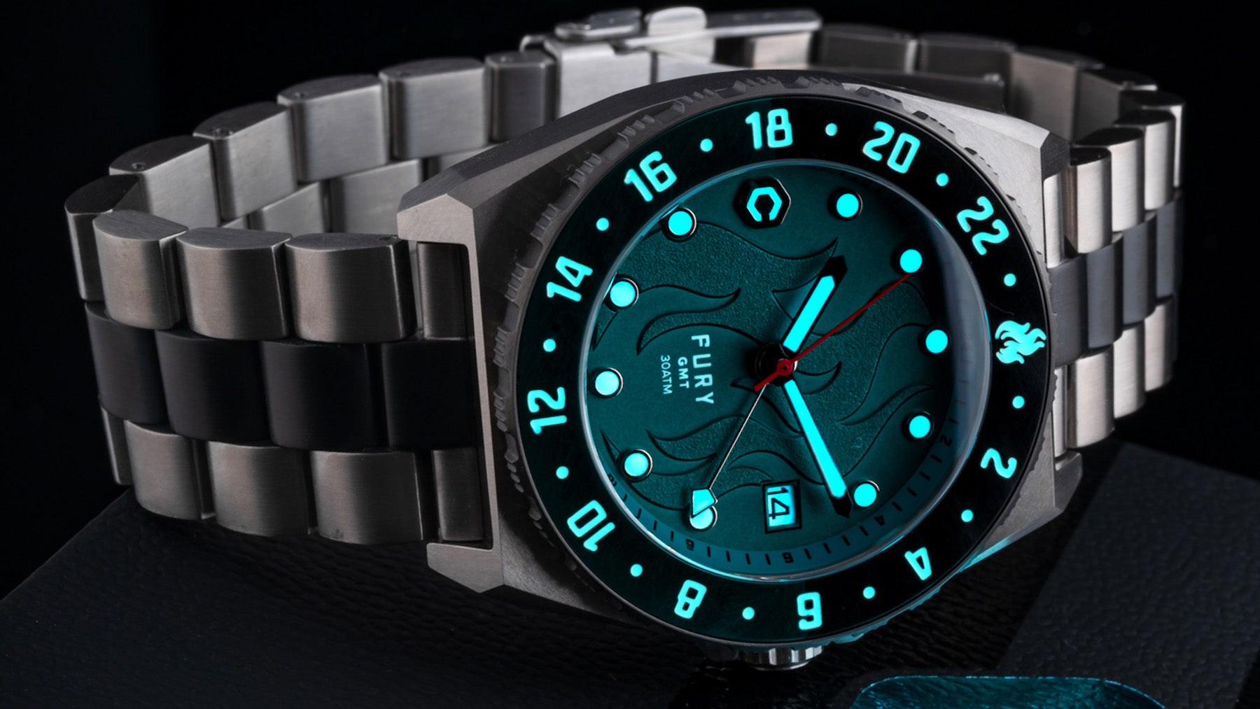 Lumibrite date window and super luminova hands, indices, and bezel